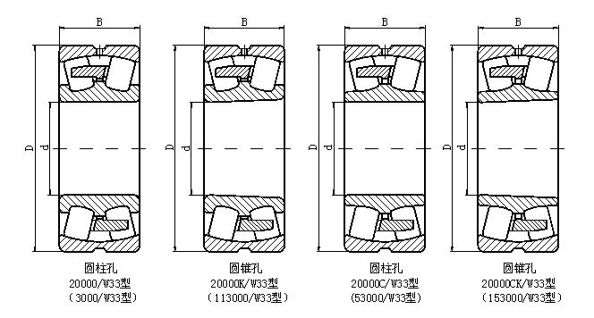 調(diào)心滾子軸承為雙列球面滾子軸承,內(nèi)圈有兩列滾道,外圈為球面滾道,外圈滾動面中心與軸承中心一致。自動調(diào)心性能好,可補(bǔ)償軸與外殼孔之間的安裝誤差或軸撓曲使內(nèi)外圈產(chǎn)生的傾斜即同軸度誤差。該類軸承徑向負(fù)荷能力較大,同時也可承受任一方向的軸向負(fù)荷,單不能承受純軸向負(fù)荷,特別適用于重載荷或振動沖擊載荷下的工作。